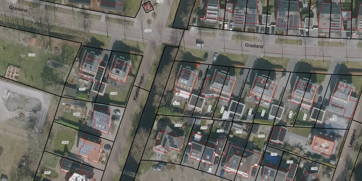 Het perceel waarop Grasland 78 staat heeft een oppervlakte van 590 m². Dit is een groot perceel. De perceeloppervlakte wordt geregistreerd door het Kadaster. Gedetailleerde informatie over de maten van dit perceel kunt u vinden in het rapport Kadastrale kaart met maatvoering van Grasland 78.
