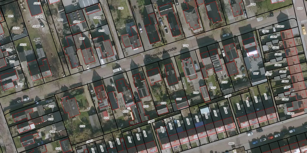 Het perceel waarop Harddraversdijk 12 staat heeft een oppervlakte van 373 m². Dit is een groot perceel. De perceeloppervlakte wordt geregistreerd door het Kadaster. Gedetailleerde informatie over de maten van dit perceel kunt u vinden in het rapport Kadastrale kaart met maatvoering van Harddraversdijk 12.