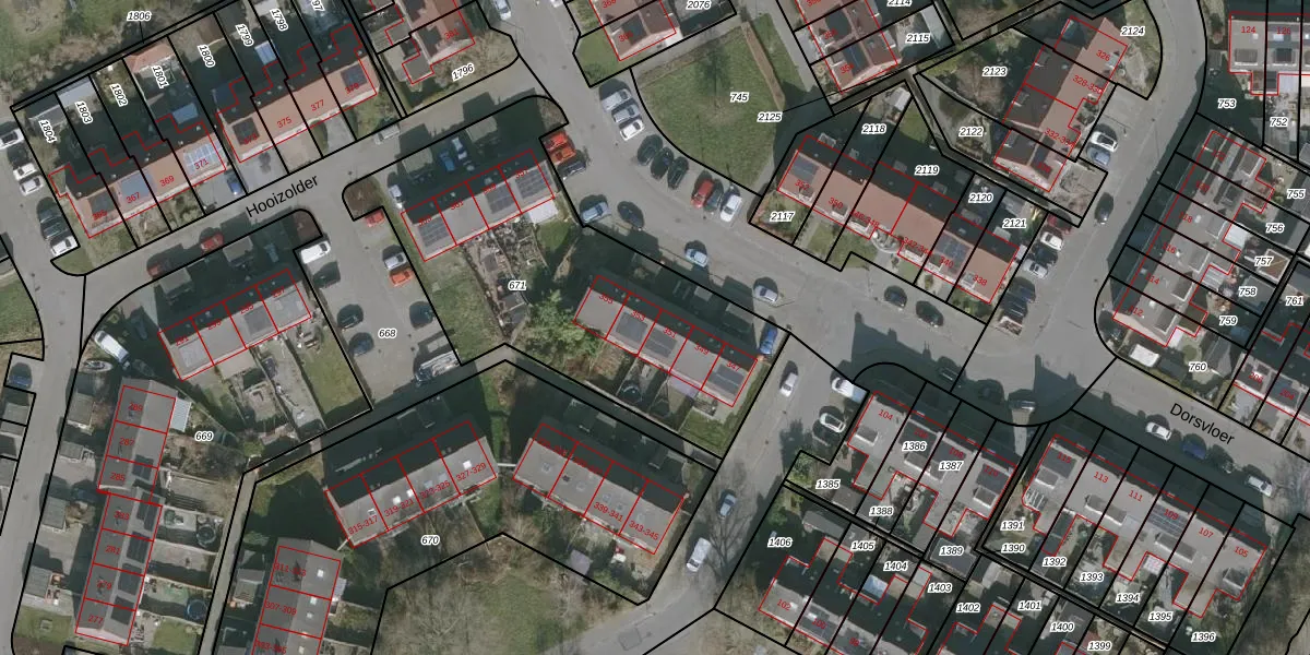 Het perceel waarop Hooizolder 351 staat heeft een oppervlakte van 1595 m². Dit is een zeer groot perceel. De perceeloppervlakte wordt geregistreerd door het Kadaster. Gedetailleerde informatie over de maten van dit perceel kunt u vinden in het rapport Kadastrale kaart met maatvoering van Hooizolder 351.
