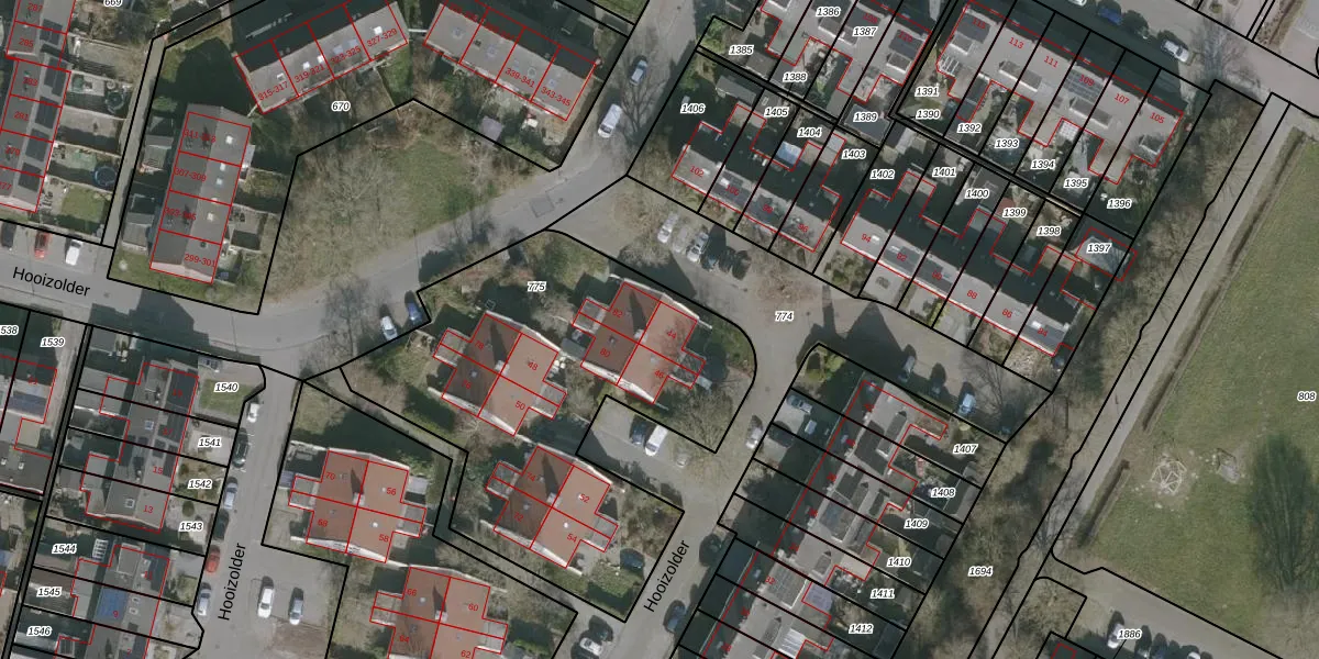 Het perceel waarop Hooizolder 44 staat heeft een oppervlakte van 1915 m². Dit is een zeer groot perceel. De perceeloppervlakte wordt geregistreerd door het Kadaster. Gedetailleerde informatie over de maten van dit perceel kunt u vinden in het rapport Kadastrale kaart met maatvoering van Hooizolder 44.