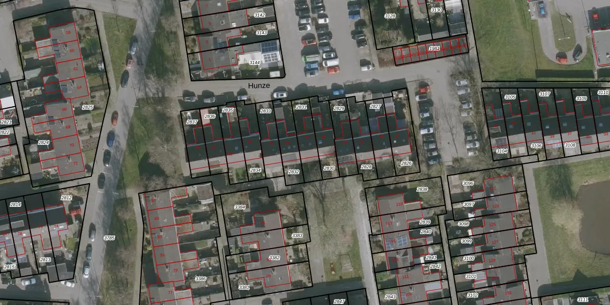 Het perceel waarop Hunze 57 staat heeft een oppervlakte van 164 m². Dit is een middelgroot perceel. De perceeloppervlakte wordt geregistreerd door het Kadaster. Gedetailleerde informatie over de maten van dit perceel kunt u vinden in het rapport Kadastrale kaart met maatvoering van Hunze 57.
