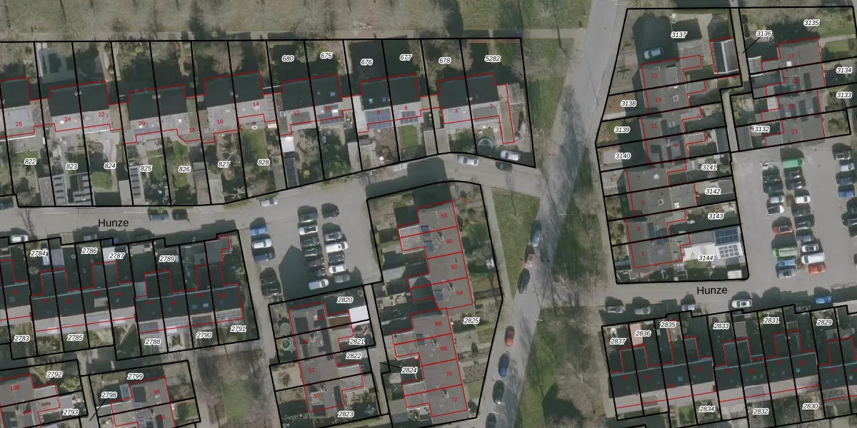 Het perceel waarop Hunze 58 staat heeft een oppervlakte van 1430 m². Dit is een zeer groot perceel. De perceeloppervlakte wordt geregistreerd door het Kadaster. Gedetailleerde informatie over de maten van dit perceel kunt u vinden in het rapport Kadastrale kaart met maatvoering van Hunze 58.