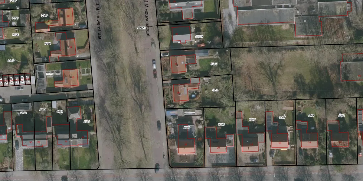 Het perceel waarop J.M.Houwenstraat 35 staat heeft een oppervlakte van 647 m². Dit is een groot perceel. De perceeloppervlakte wordt geregistreerd door het Kadaster. Gedetailleerde informatie over de maten van dit perceel kunt u vinden in het rapport Kadastrale kaart met maatvoering van J.M.Houwenstraat 35.