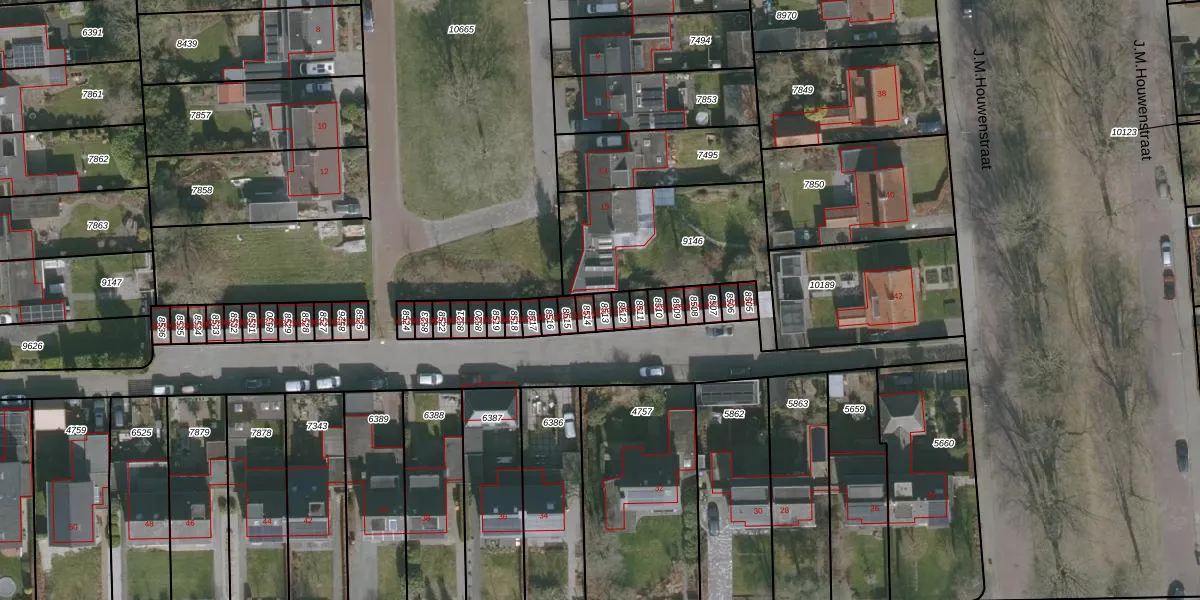 Het perceel waarop J.M.Houwenstraat 42-9 staat heeft een oppervlakte van 19 m². Dit is een klein perceel. De perceeloppervlakte wordt geregistreerd door het Kadaster. Gedetailleerde informatie over de maten van dit perceel kunt u vinden in het rapport Kadastrale kaart met maatvoering van J.M.Houwenstraat 42-9.