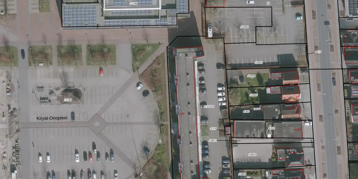 Het perceel waarop Kiryat-Onoplein 65 staat heeft een oppervlakte van 3198 m². Dit is een zeer groot perceel. De perceeloppervlakte wordt geregistreerd door het Kadaster. Gedetailleerde informatie over de maten van dit perceel kunt u vinden in het rapport Kadastrale kaart met maatvoering van Kiryat-Onoplein 65.