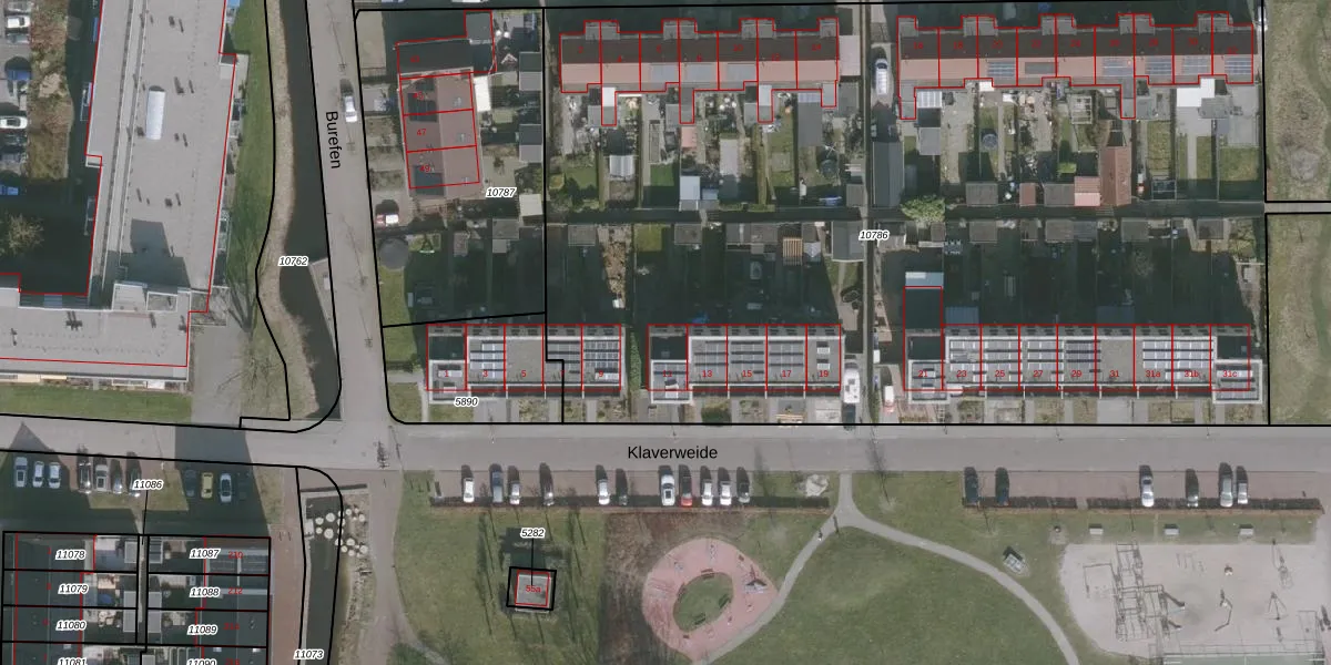 Het perceel waarop Klaverweide 11 staat heeft een oppervlakte van 6895 m². Dit is een zeer groot perceel. De perceeloppervlakte wordt geregistreerd door het Kadaster. Gedetailleerde informatie over de maten van dit perceel kunt u vinden in het rapport Kadastrale kaart met maatvoering van Klaverweide 11.