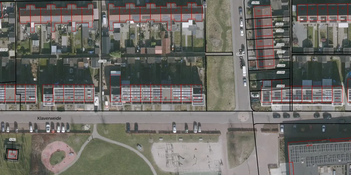 Het perceel waarop Klaverweide 31-a staat heeft een oppervlakte van 6895 m². Dit is een zeer groot perceel. De perceeloppervlakte wordt geregistreerd door het Kadaster. Gedetailleerde informatie over de maten van dit perceel kunt u vinden in het rapport Kadastrale kaart met maatvoering van Klaverweide 31-a.