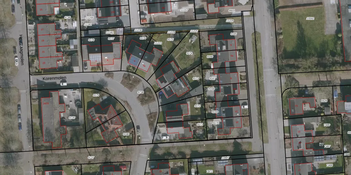 Het perceel waarop Korenmolen 9 staat heeft een oppervlakte van 342 m². Dit is een groot perceel. De perceeloppervlakte wordt geregistreerd door het Kadaster. Gedetailleerde informatie over de maten van dit perceel kunt u vinden in het rapport Kadastrale kaart met maatvoering van Korenmolen 9.
