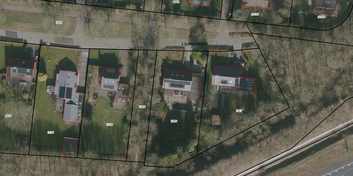 Het perceel waarop Lijsterbeswal 8 staat heeft een oppervlakte van 1878 m². Dit is een zeer groot perceel. De perceeloppervlakte wordt geregistreerd door het Kadaster. Gedetailleerde informatie over de maten van dit perceel kunt u vinden in het rapport Kadastrale kaart met maatvoering van Lijsterbeswal 8.
