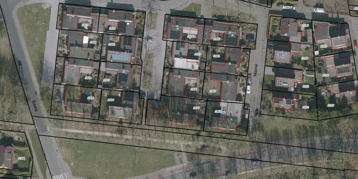 Het perceel waarop Marne 59 staat heeft een oppervlakte van 353 m². Dit is een groot perceel. De perceeloppervlakte wordt geregistreerd door het Kadaster. Gedetailleerde informatie over de maten van dit perceel kunt u vinden in het rapport Kadastrale kaart met maatvoering van Marne 59.