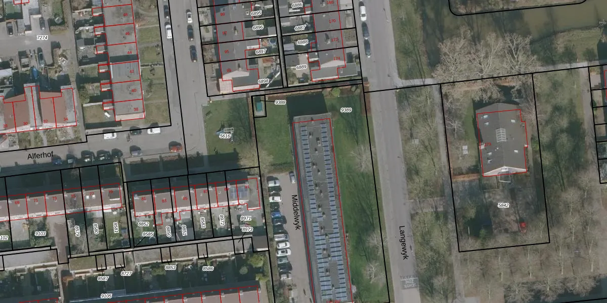 Het perceel waarop Middelwyk 151 staat heeft een oppervlakte van 2691 m². Dit is een zeer groot perceel. De perceeloppervlakte wordt geregistreerd door het Kadaster. Gedetailleerde informatie over de maten van dit perceel kunt u vinden in het rapport Kadastrale kaart met maatvoering van Middelwyk 151.