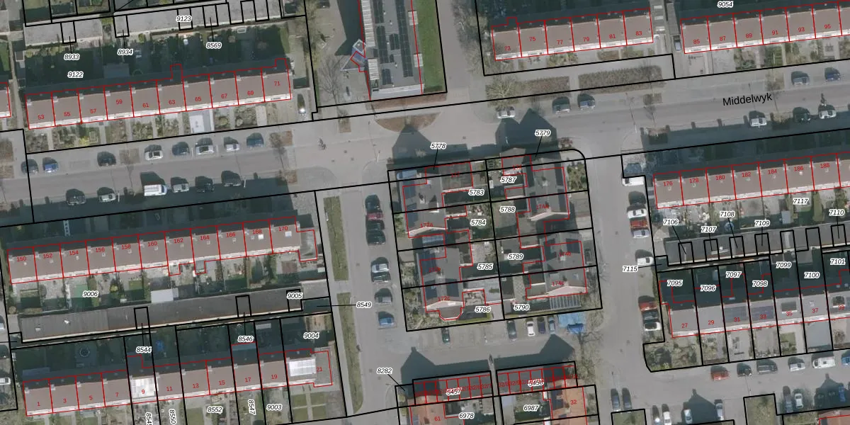 Middelwyk 172-a is gelegen op kadastraal perceel DTN02B5784. Deze kadastrale aanduiding is uniek en wordt gebruikt door het Kadaster om eigendomsrechten en andere zakelijke rechten vast te leggen. Het perceel maakt onderdeel uit van de kadastrale gemeente Drachten.