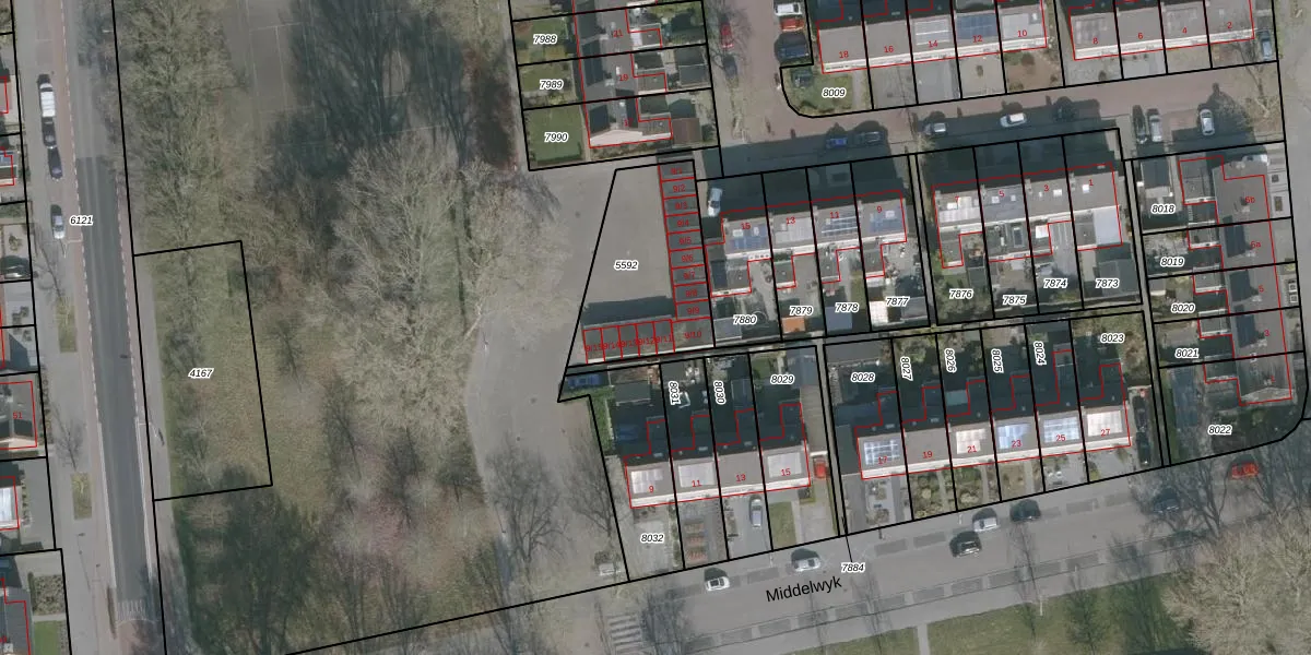 Het perceel waarop Middelwyk 9-11 staat heeft een oppervlakte van 507 m². Dit is een groot perceel. De perceeloppervlakte wordt geregistreerd door het Kadaster. Gedetailleerde informatie over de maten van dit perceel kunt u vinden in het rapport Kadastrale kaart met maatvoering van Middelwyk 9-11.