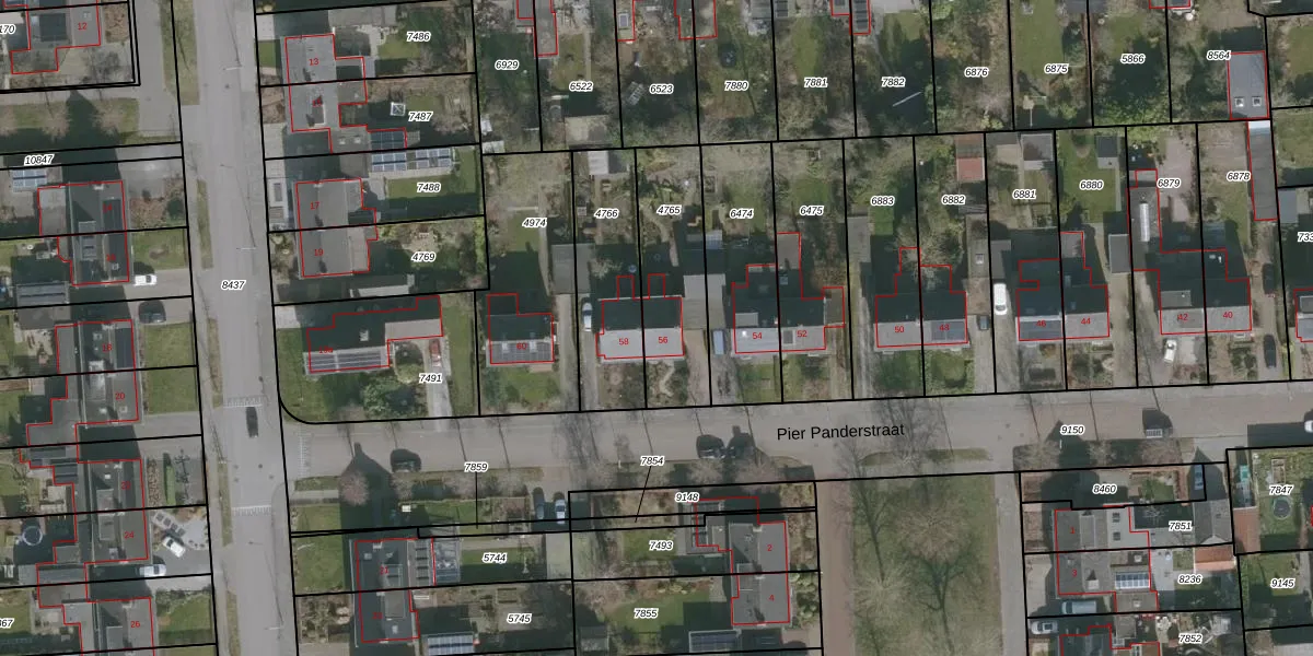 Het perceel waarop Pier Panderstraat 56 staat heeft een oppervlakte van 395 m². Dit is een groot perceel. De perceeloppervlakte wordt geregistreerd door het Kadaster. Gedetailleerde informatie over de maten van dit perceel kunt u vinden in het rapport Kadastrale kaart met maatvoering van Pier Panderstraat 56.