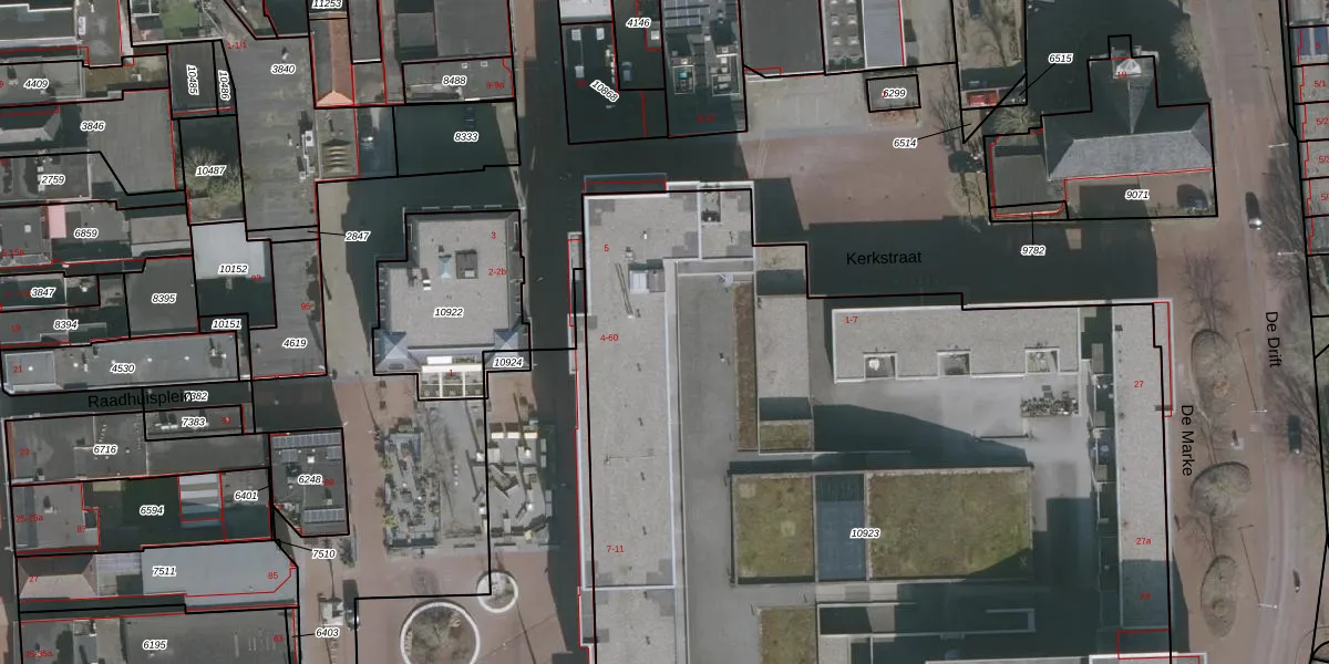 Het perceel waarop Raadhuisplein 4 staat heeft een oppervlakte van 6539 m². Dit is een zeer groot perceel. De perceeloppervlakte wordt geregistreerd door het Kadaster. Gedetailleerde informatie over de maten van dit perceel kunt u vinden in het rapport Kadastrale kaart met maatvoering van Raadhuisplein 4.