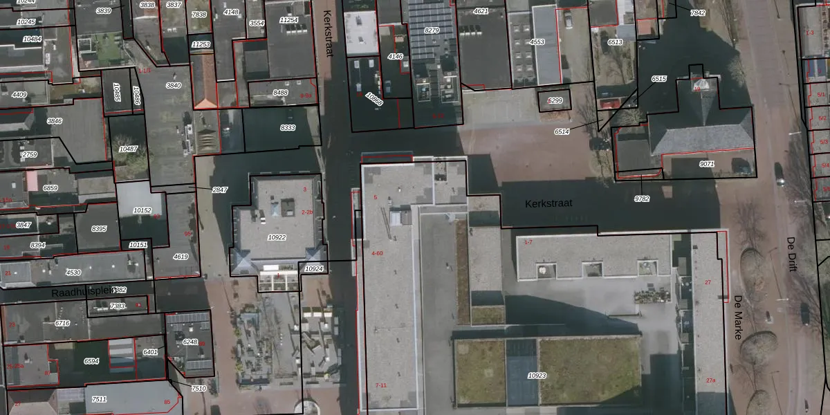 Het perceel waarop Raadhuisplein 5 staat heeft een oppervlakte van 6539 m². Dit is een zeer groot perceel. De perceeloppervlakte wordt geregistreerd door het Kadaster. Gedetailleerde informatie over de maten van dit perceel kunt u vinden in het rapport Kadastrale kaart met maatvoering van Raadhuisplein 5.