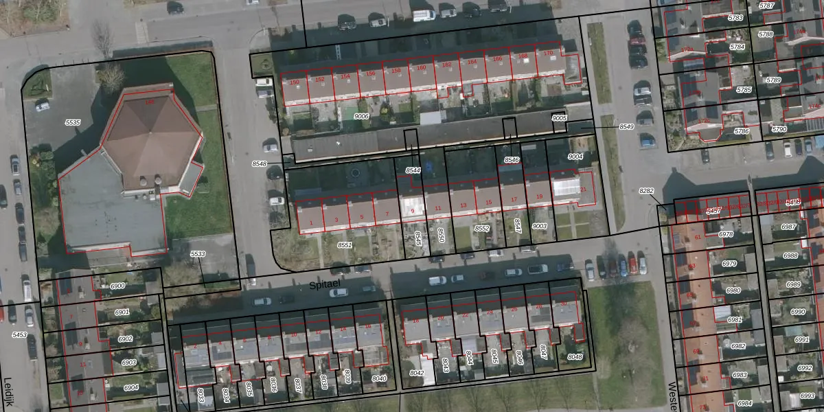 Het perceel waarop Spitael 9 staat heeft een oppervlakte van 154 m². Dit is een middelgroot perceel. De perceeloppervlakte wordt geregistreerd door het Kadaster. Gedetailleerde informatie over de maten van dit perceel kunt u vinden in het rapport Kadastrale kaart met maatvoering van Spitael 9.