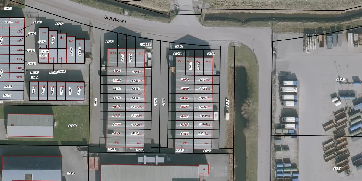 Stuurboord 10-14 is gelegen op kadastraal perceel DTN02A14059. Deze kadastrale aanduiding is uniek en wordt gebruikt door het Kadaster om eigendomsrechten en andere zakelijke rechten vast te leggen. Het perceel maakt onderdeel uit van de kadastrale gemeente Drachten.