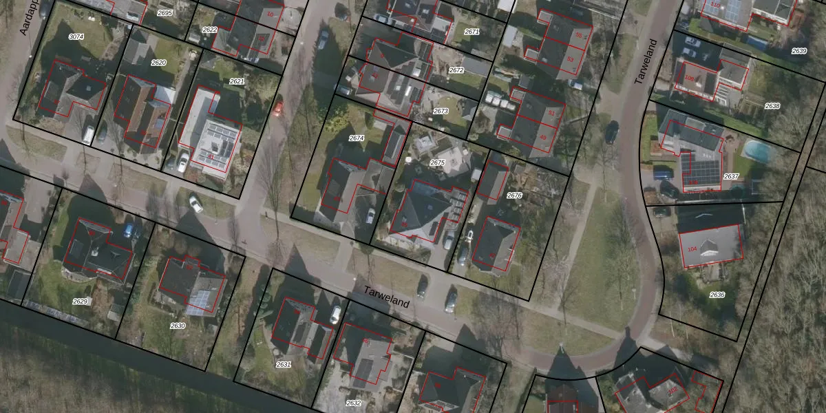 Het perceel waarop Tarweland 45 staat heeft een oppervlakte van 633 m². Dit is een groot perceel. De perceeloppervlakte wordt geregistreerd door het Kadaster. Gedetailleerde informatie over de maten van dit perceel kunt u vinden in het rapport Kadastrale kaart met maatvoering van Tarweland 45.