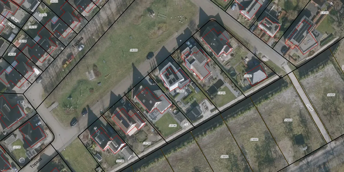 Het perceel waarop Topaas 18 staat heeft een oppervlakte van 735 m². Dit is een groot perceel. De perceeloppervlakte wordt geregistreerd door het Kadaster. Gedetailleerde informatie over de maten van dit perceel kunt u vinden in het rapport Kadastrale kaart met maatvoering van Topaas 18.
