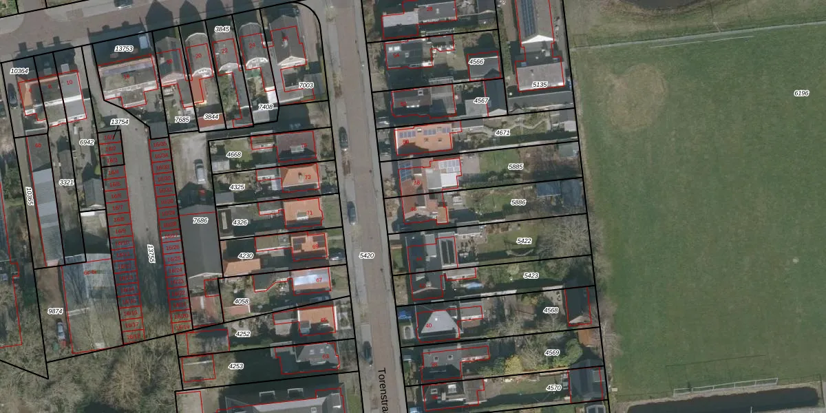 Het perceel waarop Torenstraat 46 staat heeft een oppervlakte van 422 m². Dit is een groot perceel. De perceeloppervlakte wordt geregistreerd door het Kadaster. Gedetailleerde informatie over de maten van dit perceel kunt u vinden in het rapport Kadastrale kaart met maatvoering van Torenstraat 46.