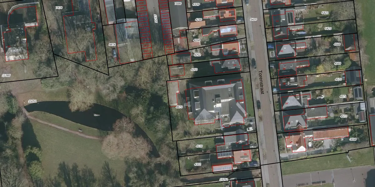 Het perceel waarop Torenstraat 59-1 staat heeft een oppervlakte van 1460 m². Dit is een zeer groot perceel. De perceeloppervlakte wordt geregistreerd door het Kadaster. Gedetailleerde informatie over de maten van dit perceel kunt u vinden in het rapport Kadastrale kaart met maatvoering van Torenstraat 59-1.