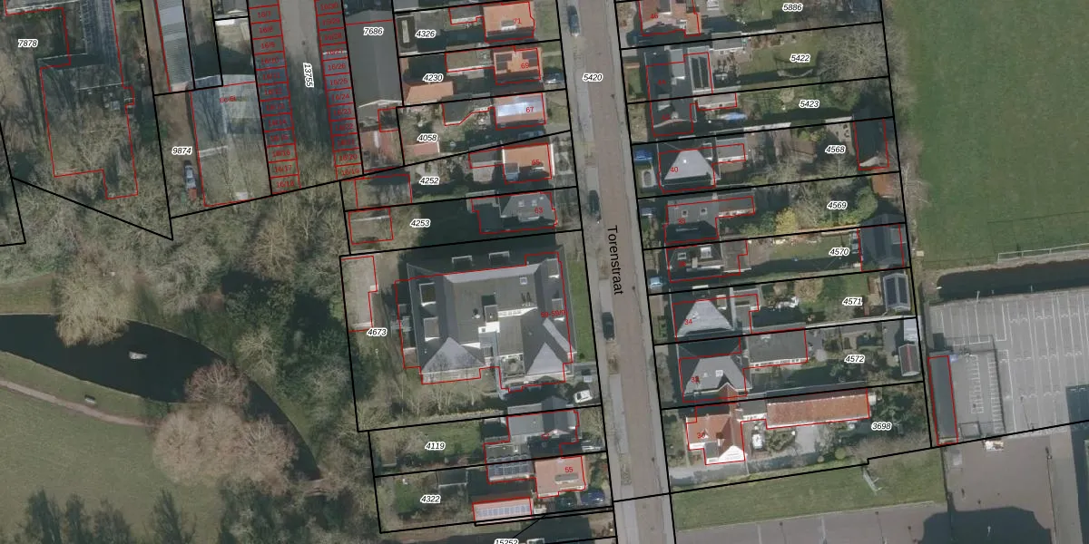Het perceel waarop Torenstraat 59-12 staat heeft een oppervlakte van 1460 m². Dit is een zeer groot perceel. De perceeloppervlakte wordt geregistreerd door het Kadaster. Gedetailleerde informatie over de maten van dit perceel kunt u vinden in het rapport Kadastrale kaart met maatvoering van Torenstraat 59-12.