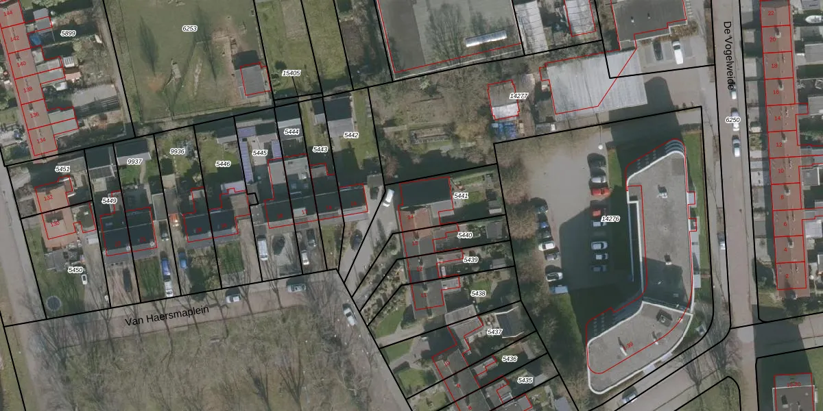 Het perceel waarop Van Haersmaplein 14 staat heeft een oppervlakte van 448 m². Dit is een groot perceel. De perceeloppervlakte wordt geregistreerd door het Kadaster. Gedetailleerde informatie over de maten van dit perceel kunt u vinden in het rapport Kadastrale kaart met maatvoering van Van Haersmaplein 14.