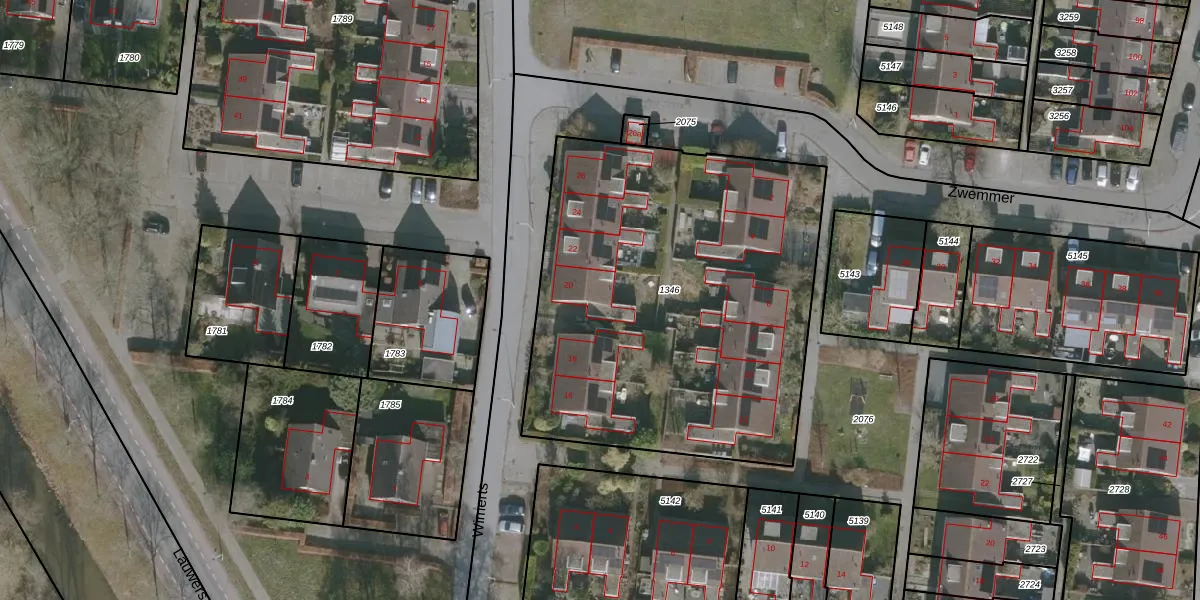 Het perceel waarop Wimerts 20 staat heeft een oppervlakte van 2278 m². Dit is een zeer groot perceel. De perceeloppervlakte wordt geregistreerd door het Kadaster. Gedetailleerde informatie over de maten van dit perceel kunt u vinden in het rapport Kadastrale kaart met maatvoering van Wimerts 20.