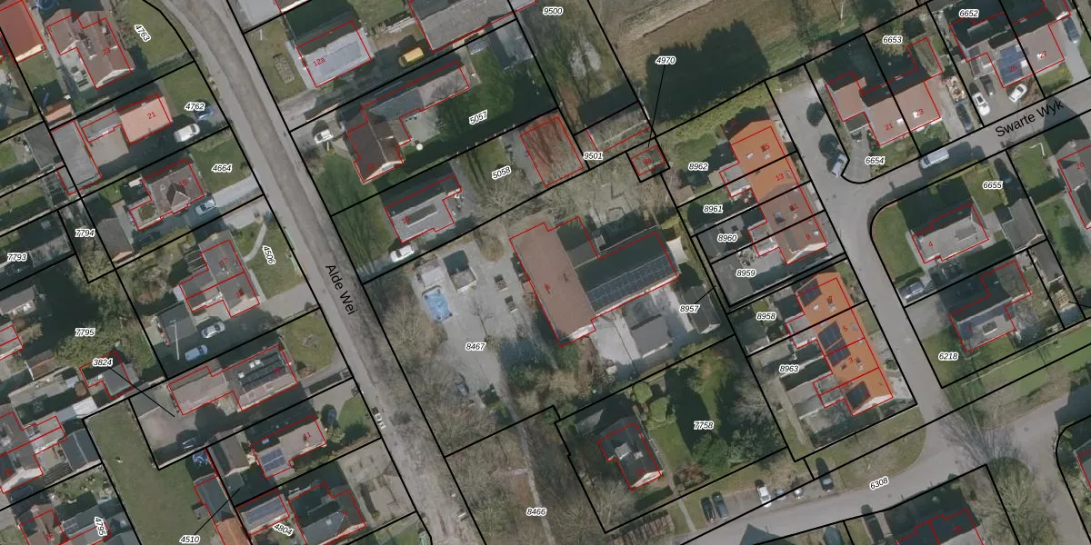 Het perceel waarop Alde Wei 8 staat heeft een oppervlakte van 2148 m². Dit is een zeer groot perceel. De perceeloppervlakte wordt geregistreerd door het Kadaster. Gedetailleerde informatie over de maten van dit perceel kunt u vinden in het rapport Kadastrale kaart met maatvoering van Alde Wei 8.