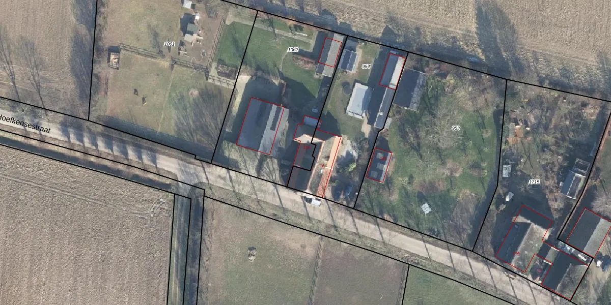 Het perceel waarop Hoefkensestraat 16-A staat heeft een oppervlakte van 1590 m². Dit is een zeer groot perceel. De perceeloppervlakte wordt geregistreerd door het Kadaster. Gedetailleerde informatie over de maten van dit perceel kunt u vinden in het rapport Kadastrale kaart met maatvoering van Hoefkensestraat 16-A.