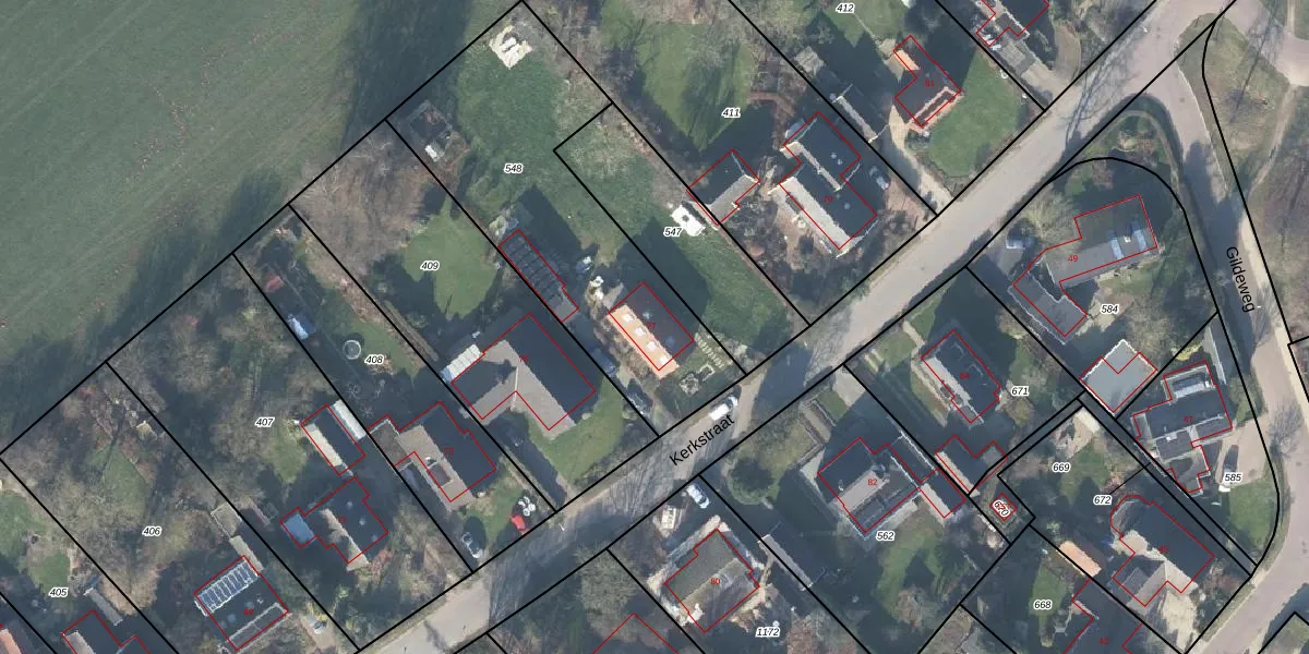 Het perceel waarop Kerkstraat 77 staat heeft een oppervlakte van 1254 m². Dit is een zeer groot perceel. De perceeloppervlakte wordt geregistreerd door het Kadaster. Gedetailleerde informatie over de maten van dit perceel kunt u vinden in het rapport Kadastrale kaart met maatvoering van Kerkstraat 77.