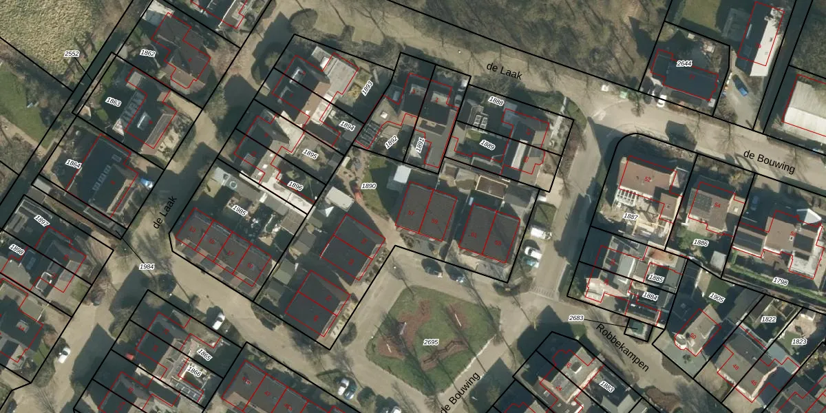 Het perceel waarop de Bouwing 57 staat heeft een oppervlakte van 1665 m². Dit is een zeer groot perceel. De perceeloppervlakte wordt geregistreerd door het Kadaster. Gedetailleerde informatie over de maten van dit perceel kunt u vinden in het rapport Kadastrale kaart met maatvoering van de Bouwing 57.