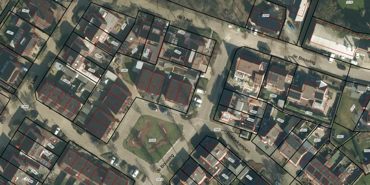 Het perceel waarop de Bouwing 63 staat heeft een oppervlakte van 1665 m². Dit is een zeer groot perceel. De perceeloppervlakte wordt geregistreerd door het Kadaster. Gedetailleerde informatie over de maten van dit perceel kunt u vinden in het rapport Kadastrale kaart met maatvoering van de Bouwing 63.
