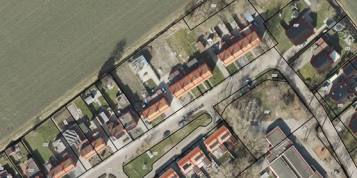 Het perceel waarop L.Stekstraat 21 staat heeft een oppervlakte van 3310 m². Dit is een zeer groot perceel. De perceeloppervlakte wordt geregistreerd door het Kadaster. Gedetailleerde informatie over de maten van dit perceel kunt u vinden in het rapport Kadastrale kaart met maatvoering van L.Stekstraat 21.
