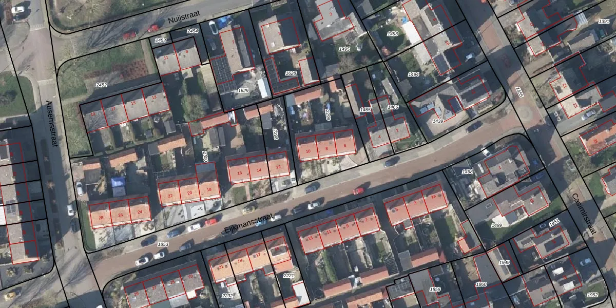 Het perceel waarop Eijkmansstraat 10 staat heeft een oppervlakte van 639 m². Dit is een groot perceel. De perceeloppervlakte wordt geregistreerd door het Kadaster. Gedetailleerde informatie over de maten van dit perceel kunt u vinden in het rapport Kadastrale kaart met maatvoering van Eijkmansstraat 10.
