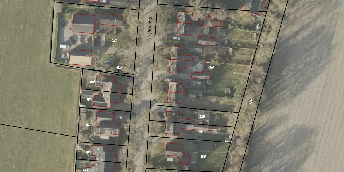 Het perceel waarop Nijenkamp 11 staat heeft een oppervlakte van 3393 m². Dit is een zeer groot perceel. De perceeloppervlakte wordt geregistreerd door het Kadaster. Gedetailleerde informatie over de maten van dit perceel kunt u vinden in het rapport Kadastrale kaart met maatvoering van Nijenkamp 11.