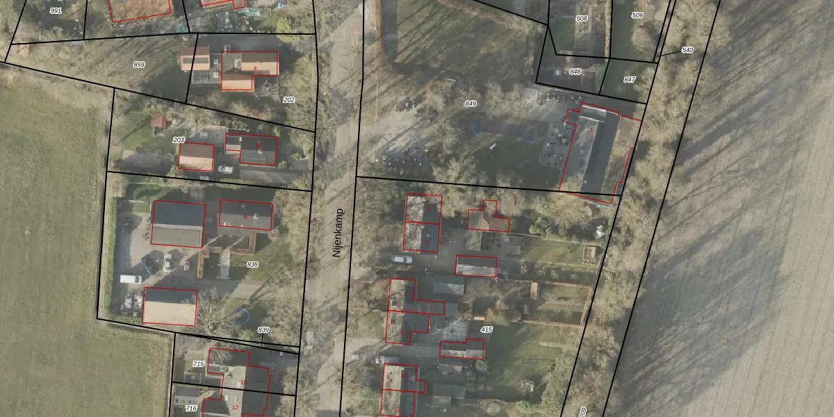 Het perceel waarop Nijenkamp 3 staat heeft een oppervlakte van 3393 m². Dit is een zeer groot perceel. De perceeloppervlakte wordt geregistreerd door het Kadaster. Gedetailleerde informatie over de maten van dit perceel kunt u vinden in het rapport Kadastrale kaart met maatvoering van Nijenkamp 3.