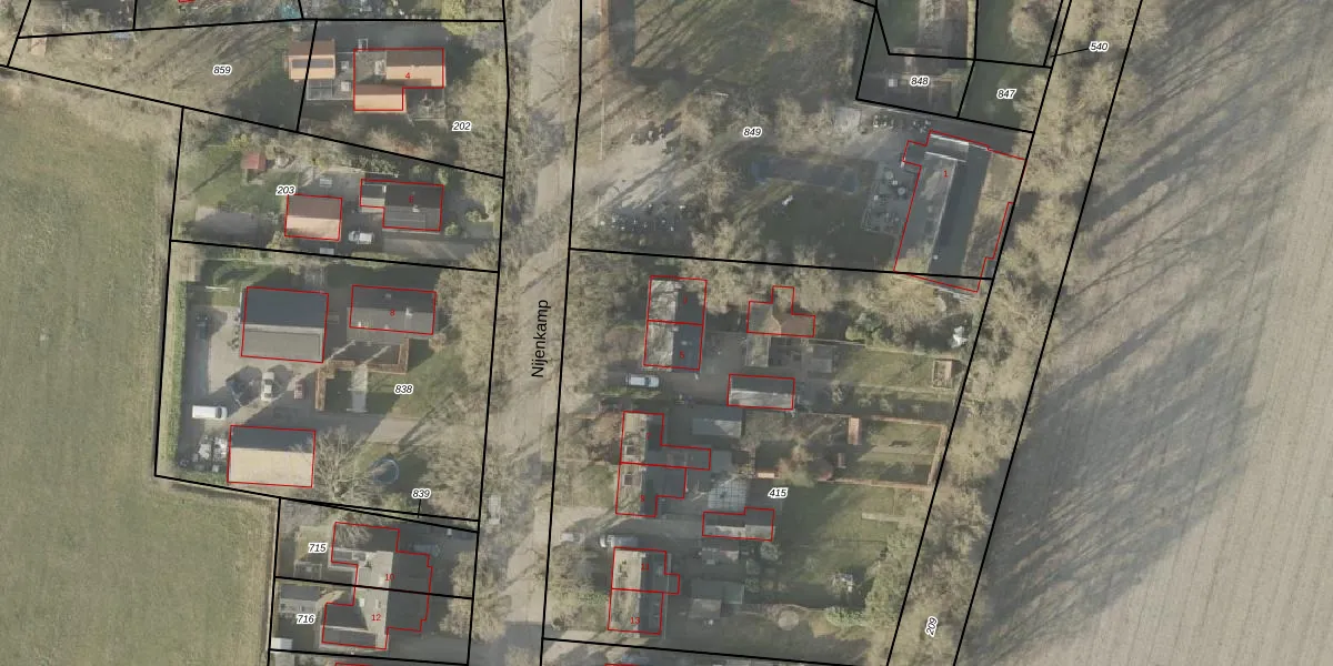 Het perceel waarop Nijenkamp 5 staat heeft een oppervlakte van 3393 m². Dit is een zeer groot perceel. De perceeloppervlakte wordt geregistreerd door het Kadaster. Gedetailleerde informatie over de maten van dit perceel kunt u vinden in het rapport Kadastrale kaart met maatvoering van Nijenkamp 5.