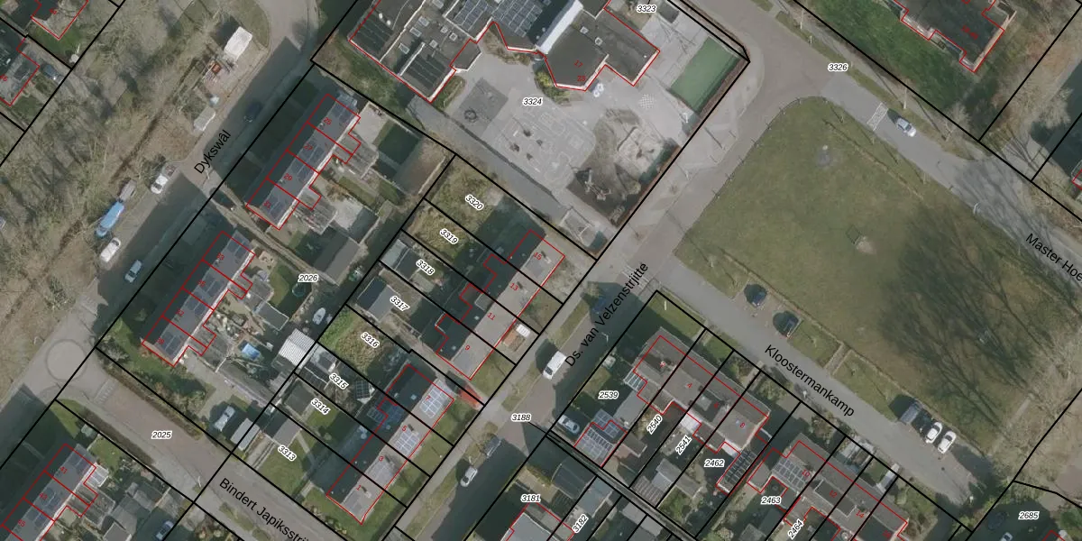 Het perceel waarop Ds. van Velzenstrjitte 15 staat heeft een oppervlakte van 330 m². Dit is een groot perceel. De perceeloppervlakte wordt geregistreerd door het Kadaster. Gedetailleerde informatie over de maten van dit perceel kunt u vinden in het rapport Kadastrale kaart met maatvoering van Ds. van Velzenstrjitte 15.