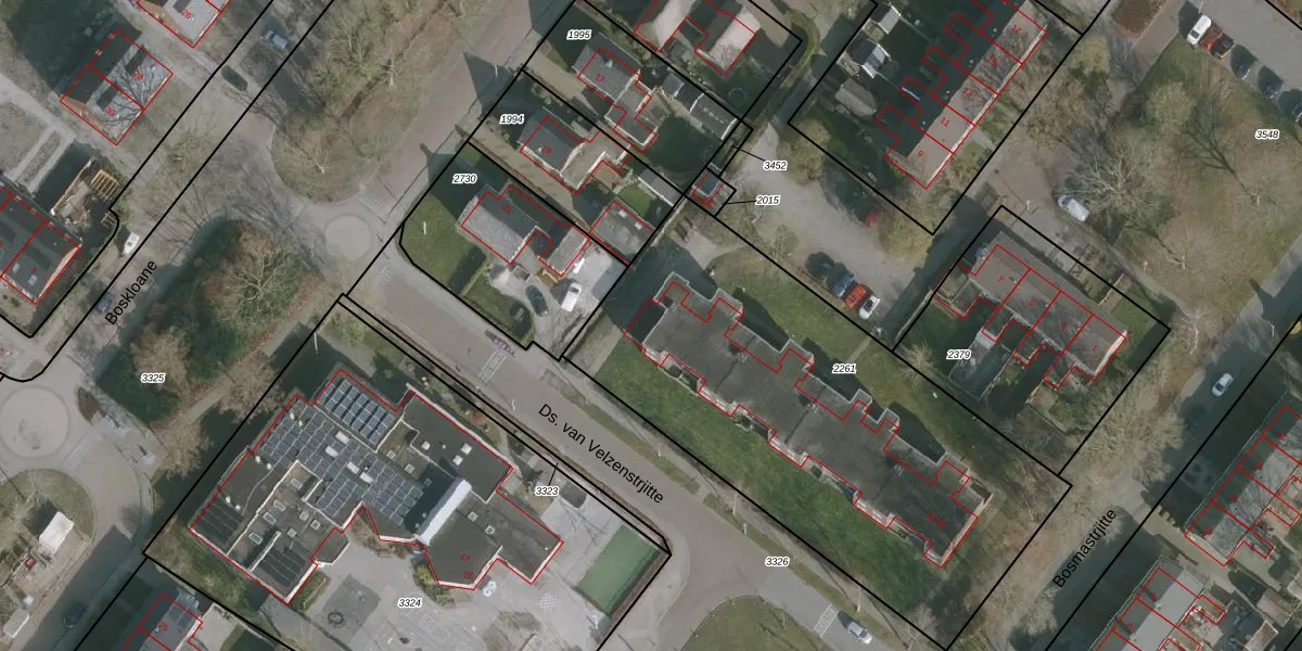 Het perceel waarop Ds. van Velzenstrjitte 18 staat heeft een oppervlakte van 2385 m². Dit is een zeer groot perceel. De perceeloppervlakte wordt geregistreerd door het Kadaster. Gedetailleerde informatie over de maten van dit perceel kunt u vinden in het rapport Kadastrale kaart met maatvoering van Ds. van Velzenstrjitte 18.