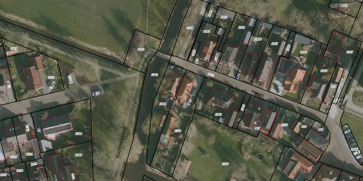 Het perceel waarop Haven 13 staat heeft een oppervlakte van 715 m². Dit is een groot perceel. De perceeloppervlakte wordt geregistreerd door het Kadaster. Gedetailleerde informatie over de maten van dit perceel kunt u vinden in het rapport Kadastrale kaart met maatvoering van Haven 13.