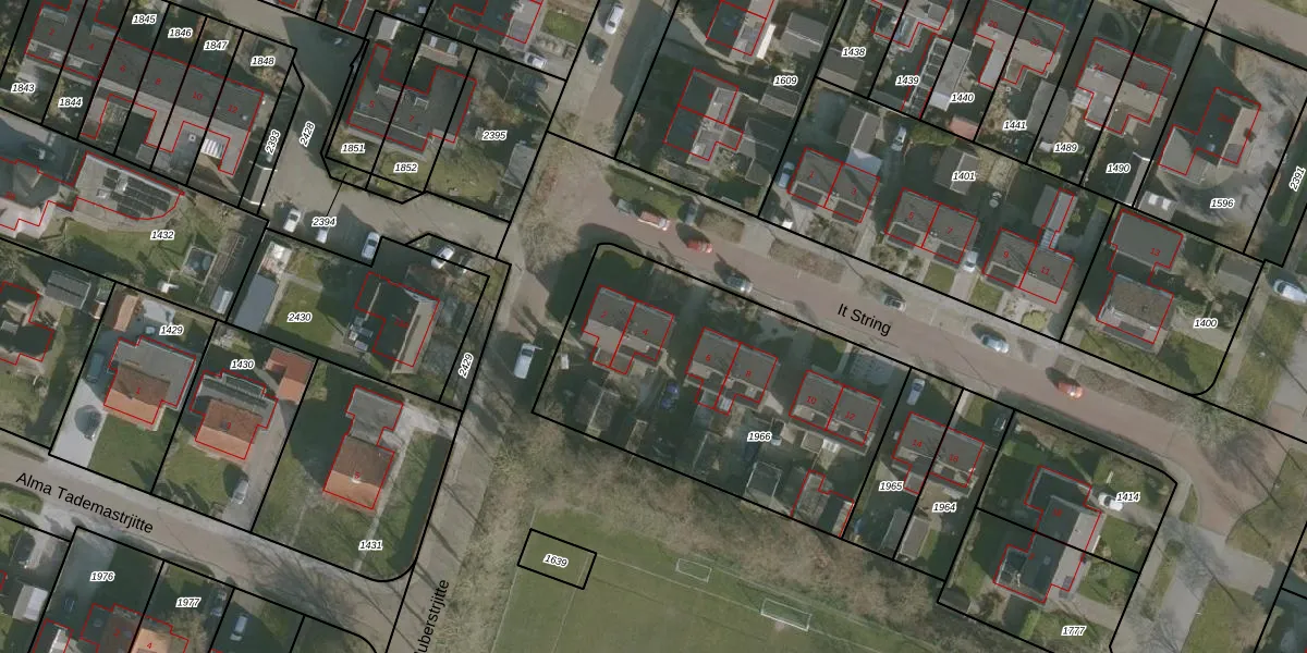 Het perceel waarop It String 4 staat heeft een oppervlakte van 1463 m². Dit is een zeer groot perceel. De perceeloppervlakte wordt geregistreerd door het Kadaster. Gedetailleerde informatie over de maten van dit perceel kunt u vinden in het rapport Kadastrale kaart met maatvoering van It String 4.