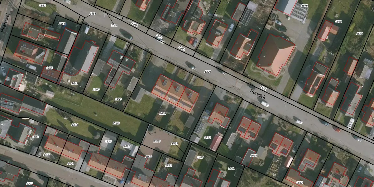 Het perceel waarop Puoldyk 12 staat heeft een oppervlakte van 1330 m². Dit is een zeer groot perceel. De perceeloppervlakte wordt geregistreerd door het Kadaster. Gedetailleerde informatie over de maten van dit perceel kunt u vinden in het rapport Kadastrale kaart met maatvoering van Puoldyk 12.