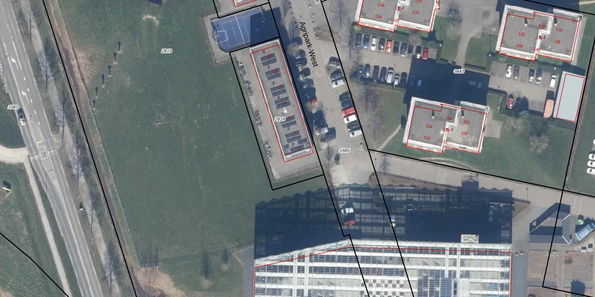 Het perceel waarop Agripark-West 5 staat heeft een oppervlakte van 870 m². Dit is een groot perceel. De perceeloppervlakte wordt geregistreerd door het Kadaster. Gedetailleerde informatie over de maten van dit perceel kunt u vinden in het rapport Kadastrale kaart met maatvoering van Agripark-West 5.