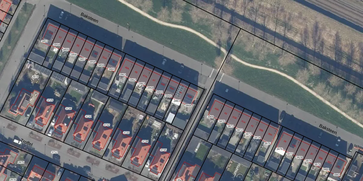 Het perceel waarop Baksteen 45 staat heeft een oppervlakte van 137 m². Dit is een middelgroot perceel. De perceeloppervlakte wordt geregistreerd door het Kadaster. Gedetailleerde informatie over de maten van dit perceel kunt u vinden in het rapport Kadastrale kaart met maatvoering van Baksteen 45.
