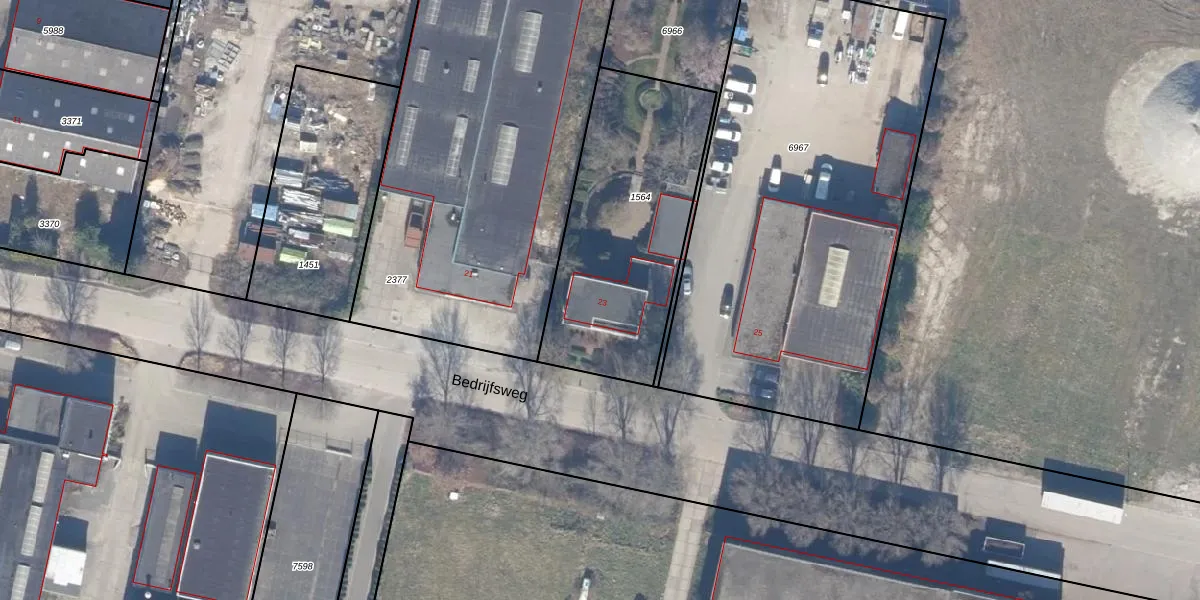 Het perceel waarop Bedrijfsweg 23 staat heeft een oppervlakte van 1002 m². Dit is een zeer groot perceel. De perceeloppervlakte wordt geregistreerd door het Kadaster. Gedetailleerde informatie over de maten van dit perceel kunt u vinden in het rapport Kadastrale kaart met maatvoering van Bedrijfsweg 23.