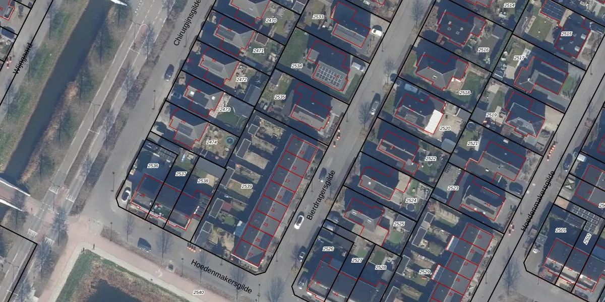 Het perceel waarop Bierdragersgilde 13 staat heeft een oppervlakte van 1322 m². Dit is een zeer groot perceel. De perceeloppervlakte wordt geregistreerd door het Kadaster. Gedetailleerde informatie over de maten van dit perceel kunt u vinden in het rapport Kadastrale kaart met maatvoering van Bierdragersgilde 13.