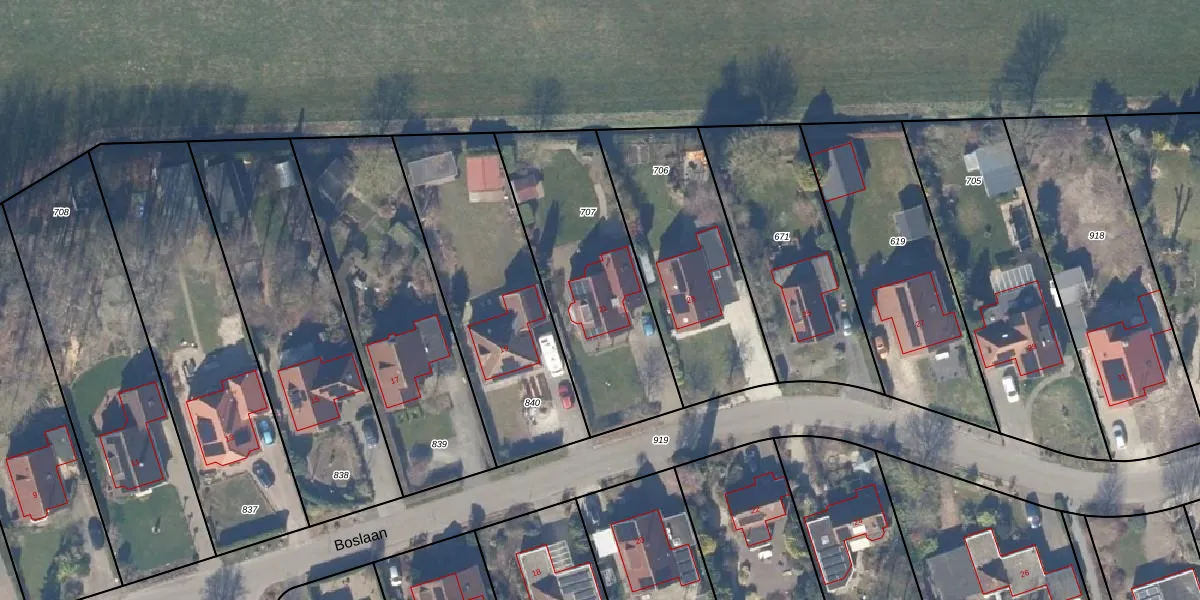 Het perceel waarop Boslaan 21 staat heeft een oppervlakte van 833 m². Dit is een groot perceel. De perceeloppervlakte wordt geregistreerd door het Kadaster. Gedetailleerde informatie over de maten van dit perceel kunt u vinden in het rapport Kadastrale kaart met maatvoering van Boslaan 21.