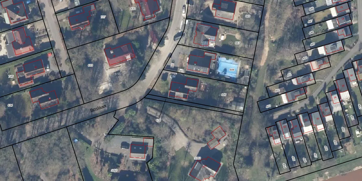 Het perceel waarop Boslaan 65 staat heeft een oppervlakte van 760 m². Dit is een groot perceel. De perceeloppervlakte wordt geregistreerd door het Kadaster. Gedetailleerde informatie over de maten van dit perceel kunt u vinden in het rapport Kadastrale kaart met maatvoering van Boslaan 65.